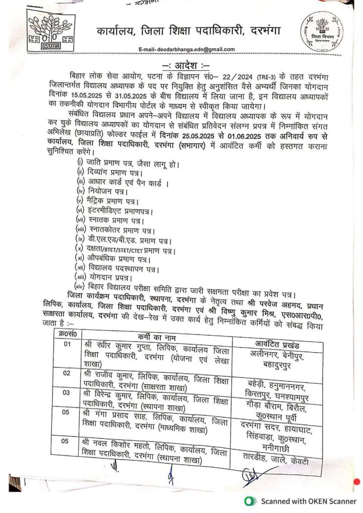 बिहार लोक सेवा आयोग द्वारा TRE 3.0 के विद्यालय अध्यापकों का विद्यालय में योगदान करने के बाद विद्यालय पदस्थापन एवं योगदान प्रपत्र संबंधित प्रखंड शिक्षा पदाधिकारियों द्वारा संकलित किया जाएगा जिसको लेकर बारी बारी से सभी जिलों के पदाधिकारियों द्वारा लगातार दिशा निर्देश जारी किए जा रहे है। चूंकि विद्यालय अध्यापक 15 मई से लेकर 31 मई तक योगदान करेंगे जिसके बाद उनका टेक्निकल योगदान सुनिश्चित होना है ताकि उनका योगदान कंप्यूटर पर सुनिश्चित हो सके और उनका डाटा मुख्याल भेजा जा सके। इसी क्रम में 21 मई को गया और दरभंगा जिला के शिक्षा विभाग ने दिशा निर्देश जारी किए हैं।