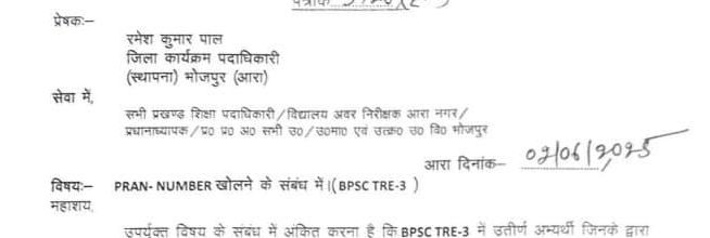BPSC TRE-3 के तहत नियुक्त विद्यालय शिक्षकों के लिए PRAN नंबर खोलने की प्रक्रिया शुरू, जिला शिक्षा पदाधिकारी ने जारी किए दिशा-निर्देश