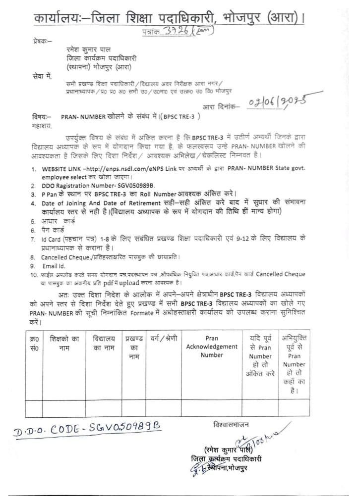 भोजपुर जिले के प्रत्येक प्रखंड को निर्देशित किया गया है कि वे अपने अधीनस्थ सभी BPSC TRE-3 विद्यालय शिक्षकों का PRAN नंबर समयबद्ध ढंग से खुलवा लें एवं निम्न प्रारूप में एक सूची कार्यालय को उपलब्ध कराना सुनिश्चित करें।